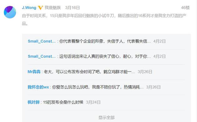 在黄章声称魅族15只是小试牛刀之后,不少粉丝留言表示“希望越大,失望越大”。