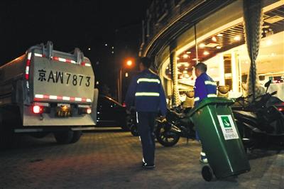 昨晚10时,朝阳区延静里中街玉林烤鸭店,工作人员将厨余垃圾拉上清运车。新京报实习生 陈婉婷 摄