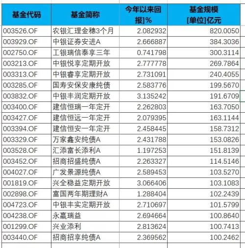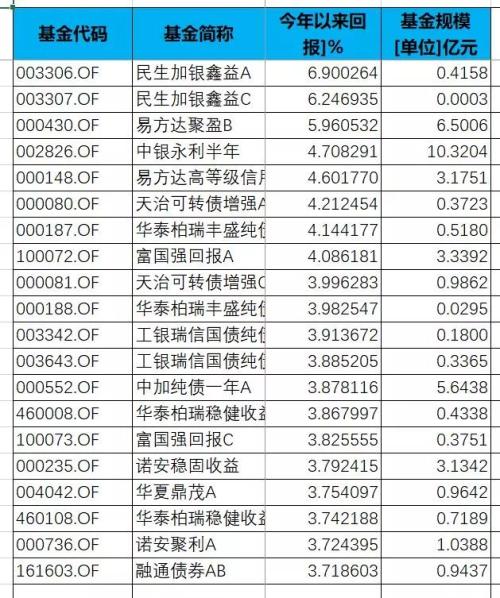 这些规模小于1亿的基金收益率高是由于巨额赎回导致的吗? 我也不知道啊。但是你看看规模比较大的那几个,易方达聚盈、中银永利、富国强回报、中加纯债都还是非常不错的。