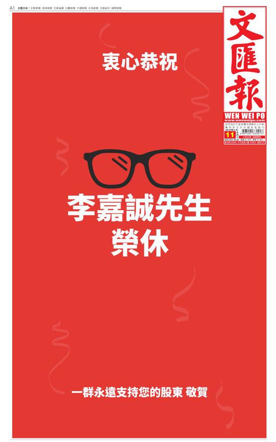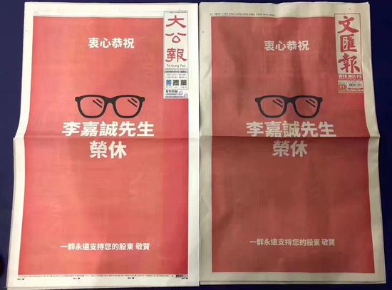 香港首富、一代华人商界领袖李嘉诚昨天正式退任长和集团董事会主席,今天香港主要报纸的头版都被李嘉诚先生的支持者包下,打出整版广告祝贺他荣休。这些报纸包括香港文汇报、大公报、明报、星岛日报、香港经济日报、东方日报。香港信报未有刊登。
