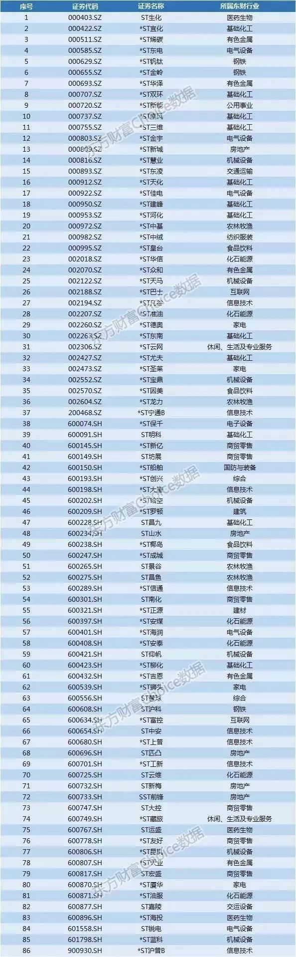 东方财富Choice数据显示,从有退市风险的个股来看,A股目前共有86只。