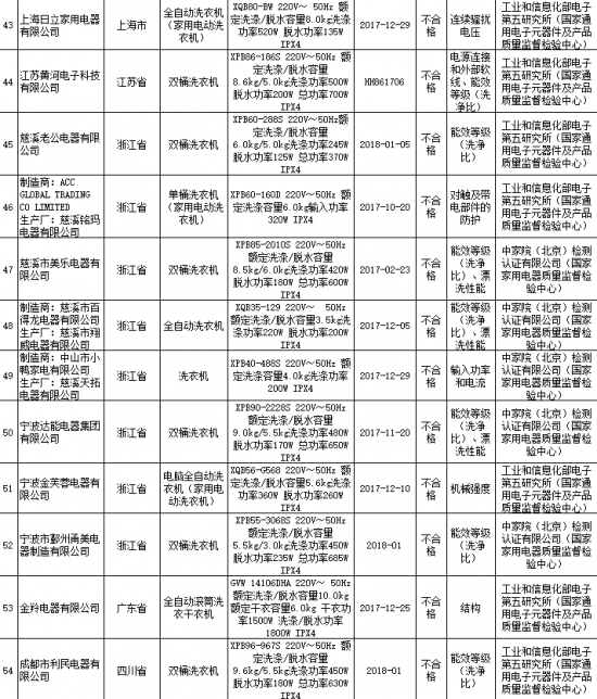 2018年第2批,共抽查了54家企业生产的54批次家用电动洗衣机。抽查发现共有个批次的产品不符合标准的规定,涉及的不合格项目有对触及带电部件的防护、输入功率和电流、机械强度、结构、电源连接和外部软线、漂洗性能、洗净比、连续骚扰电压项目。