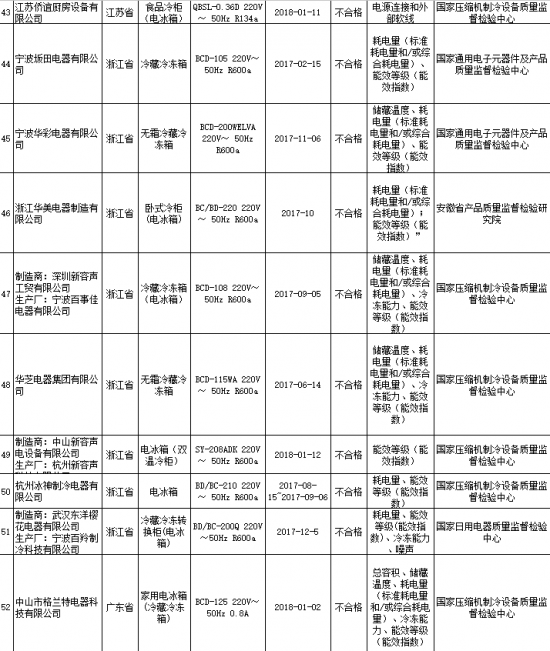 2018年第2批,共抽查了52家企业生产的52批次电冰箱产品。抽查发现有批次产品不符合标准的规定,涉及到电源连接和外部软线、噪声、总容积、储藏温度、耗电量(标准耗电量和/或综合耗电量)、冷冻能力、能效等级(能效指数)项目。
