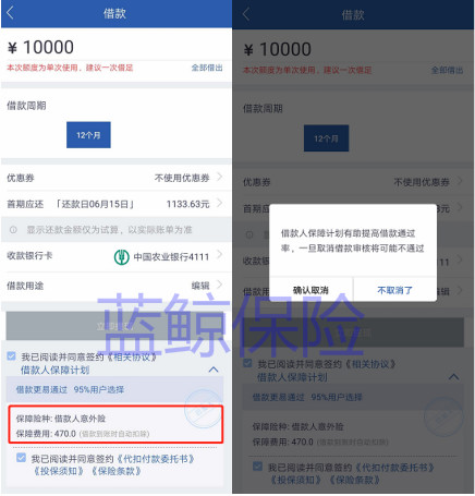 近日,蓝鲸保险调查发现,目前,不少借贷平台确实存有默认勾选保险产品、强制购买保险产品否则无法取得借款的情况。从保险产品提供方来看,包括众惠相互、众安在线、易安保险、大地保险在内的多家险企,均与借贷平台存在合作关系。