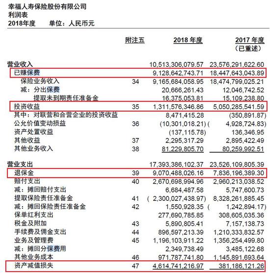 2018年幸福人寿由盈转亏,主要受多方面因素影响。2018年年报显示,幸福人寿去年保费收入仅91.29亿元,而2017年该项收入为184.48亿元,同比大降50%;去年其投资收益仅13.16亿元,比2017年的50.5亿元下降74%;此外,资产减值损失同比增长11倍,退保金却上涨了近16%。